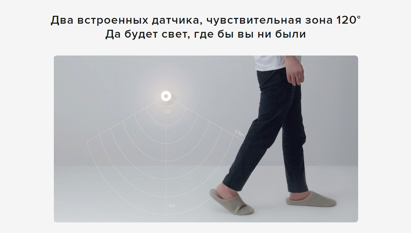 Два встроенных датчика, чувствительная зона 120°. Да будет свет, где бы вы ни былиСветильник оснащен двумя датчиками: светочувствительным датчиком и инфракрасным датчиком обнаружения движения с углом обзора до 120°. При отсутствии движения в зоне обнаружения в течение 15 секунд светильник автоматически отключается.